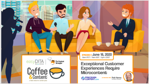 Grab a cup of joe and join this free webinar to hear Precision Content’s Rob Hanna, and easyDITA’s Patrick Bosek talk about why content creators should focus their efforts on the creation of micro—moments. Rob will help us understand the role of microcontent — self-contained, atomic pieces of content — in the construction and management of exceptional content experiences.